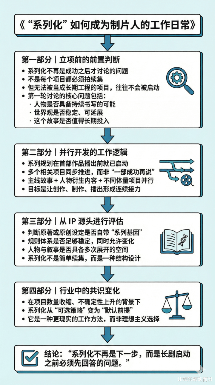 这种变化,率先体当今名目判断的起源上。往常,制片东说念主更多温雅的是单部作品的完成度、类型匹配度以及当下市集窗口;而当今,在看脚本、聊IP的第一轮考虑中,是否具备延展空间、东说念主物能否抓续书写,频频还是成为绕不开的问题。系列化不一定会被明确写进有贪图,但还是被内化为一种“先想明晰”的责任习尚。