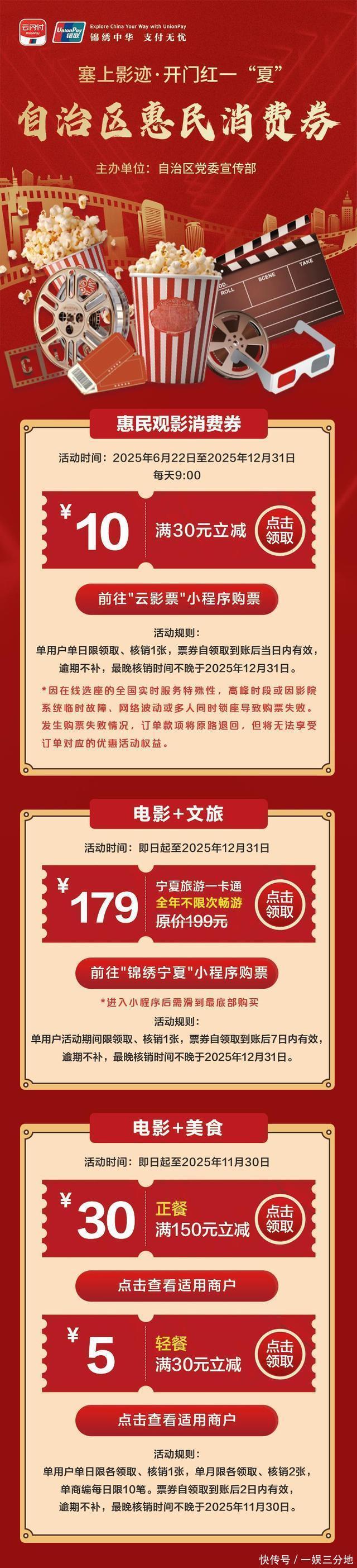 难忘先领豪侈券哦! 领取方法 1.掀开云闪付APP,参预云闪付页面 2.点击“惠民豪侈券”,领取 自治区惠民不雅影豪侈券 / 宁夏总工会电影豪侈券