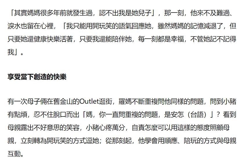 又举例回忆母亲患病经由,他说曾因母亲反复重迭团结句话而失去耐烦,就地发怒。待看到母亲狭小不安的神采后,内心深受冲击,从此立誓再也隔离母亲疾言严色。