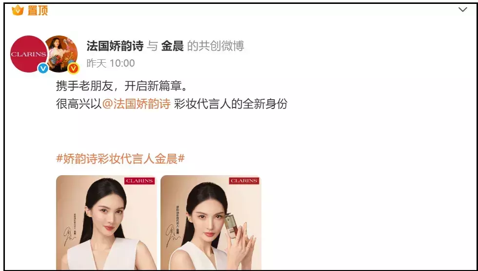 同天,法国品牌娇韵诗官宣金晨为彩妆代言东谈主。