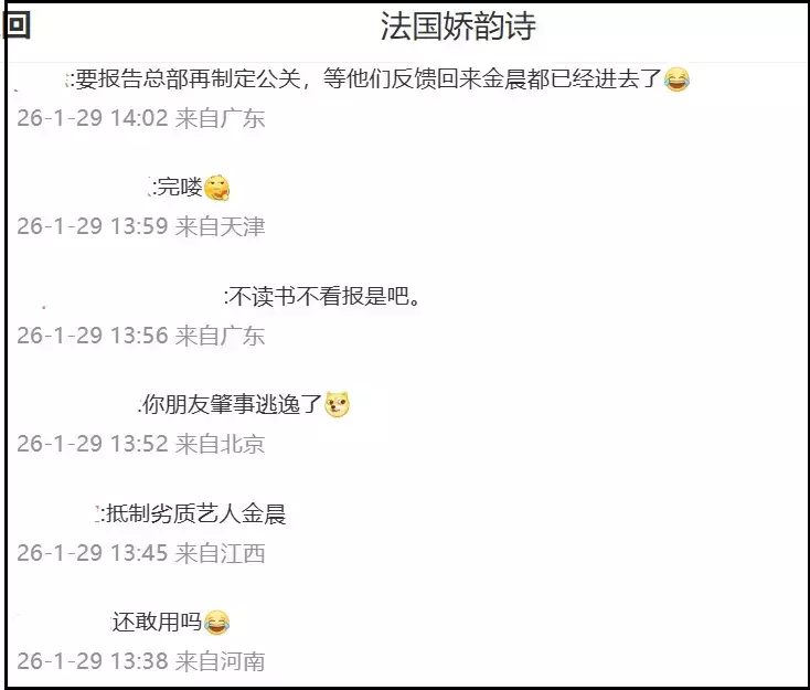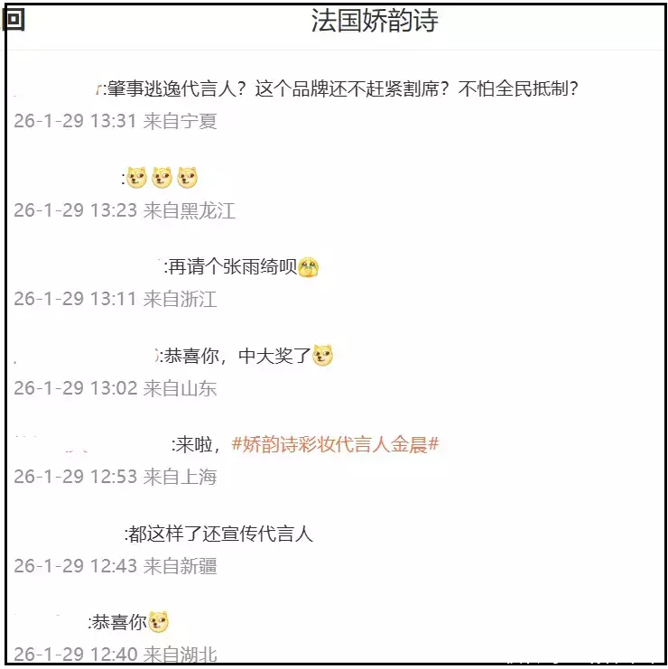 金晨本东谈主和责任室莫得第一时代修起爆料,错过黄金三小时公关期,针对她的质疑声越来越大,现在金晨最新代言娇韵诗的账号驳斥区仍是消一火了。