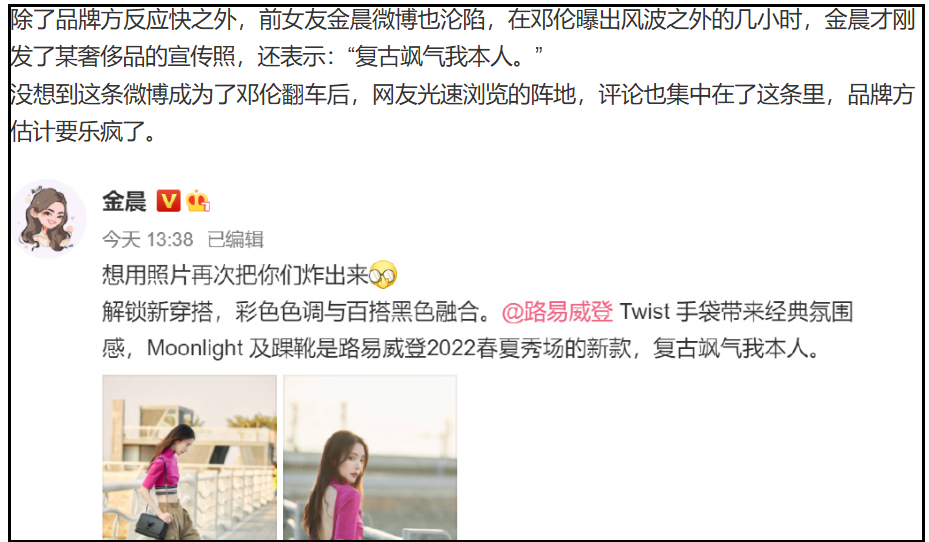 金晨如今的境遇,让东谈主忍不住联念念到了她的前男友邓某。