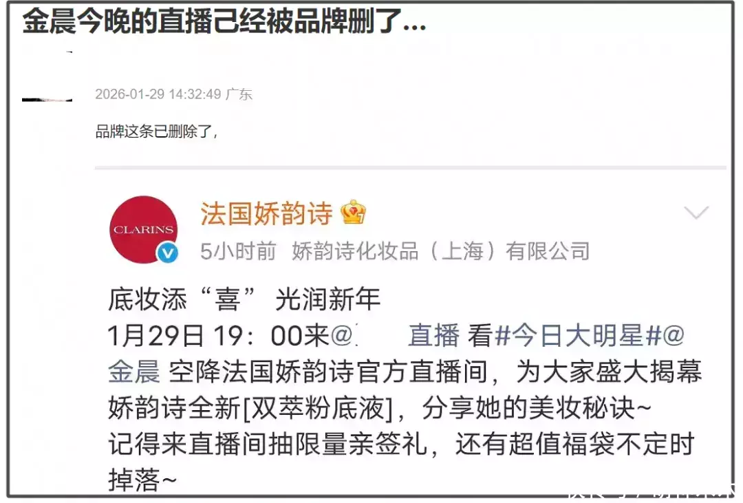 按照原定谋划,金晨还要出席娇韵诗品牌直播,喜欢打工东谈主,又要忙着给明星打理烂摊子,直播简略率取消了,品牌已删除了金晨直播预报。