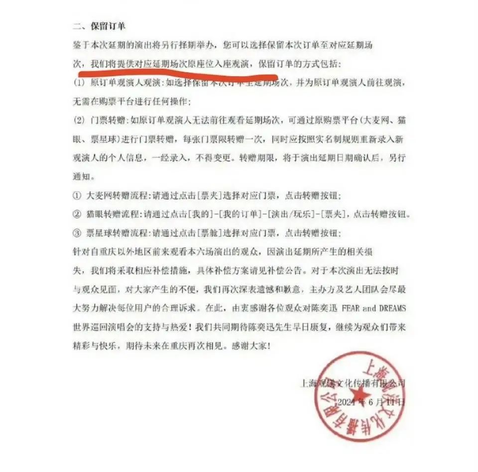 据了解,这次陈奕迅重庆演唱会本应在客岁6月举办,但因特等情况推迟到了本年3月。主持方也在其时发出公告称,演唱会再次举办时,保留订单的会提供原座位入座,于是一些歌迷并未退票。
