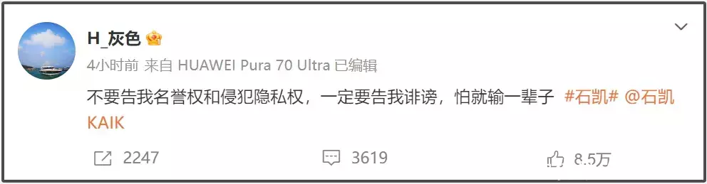 关于石凯的讼师函恢复,爆料网友绝不恐慌,公开喊话石凯,让他不要告状名誉权和骚扰狡饰权,一定要告贬低。