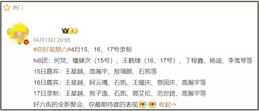 网友整理了石凯近期录制实际,发现《你好,星期六》给他的待遇卓越可以,光4月份就连系录制了三天,有爆料提到因为石凯,檀健次、丁程鑫、王鹤棣、敖瑞鹏、王星越、敖子逸等东说念主齐可能受到影响,到时候节目片断会不太连贯。