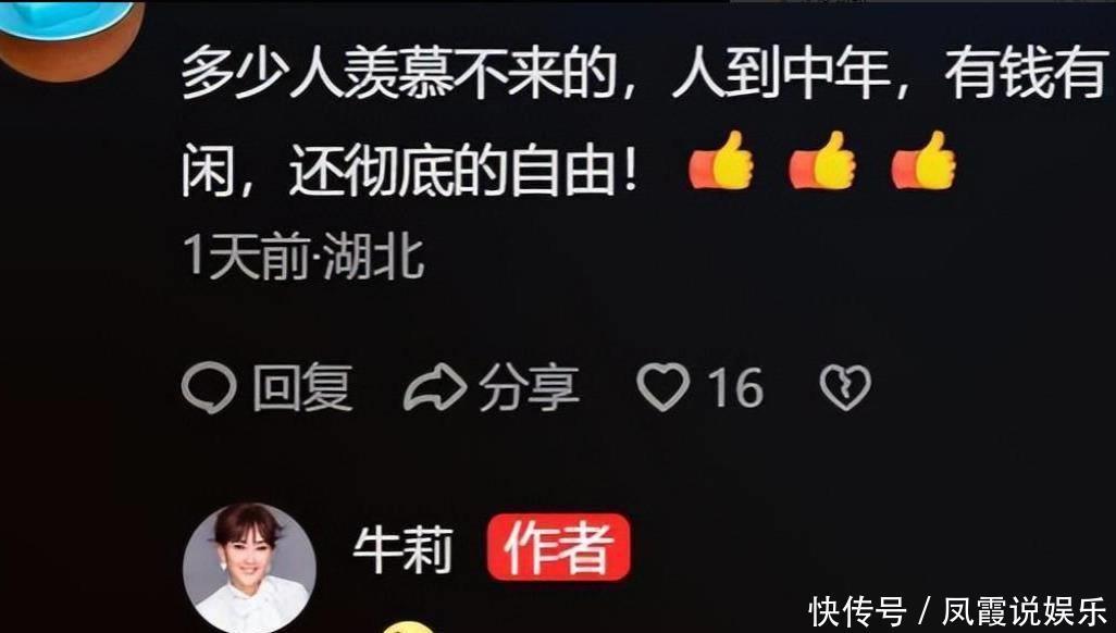 此外也有网友在留言中对她赐与饱读吹:“有那么多的东说念主都当先无法作念到,到了中年之时,既领有财帛又领有优游时光,而况还透顶地得到了目田!”牛莉对此作出了恢复,呈现出一个面带愉悦且比耶的步地包。