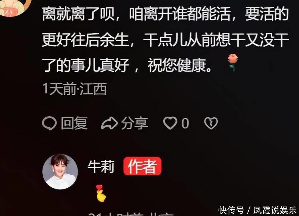 此一动态已经发布,短暂便燃烧了网友们的赞佩心。驳倒区即刻被多样千般的估计以及联系所充斥。繁密网友纷繁留言,联系她是否断然仳离。需要泄漏的是,牛莉本东说念主也现身于驳倒区,她对驳倒区里对于她仳离的驳倒进行了点赞,同期还回复了一位网友的驳倒。